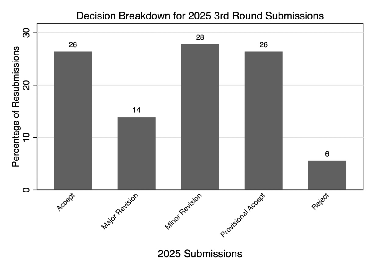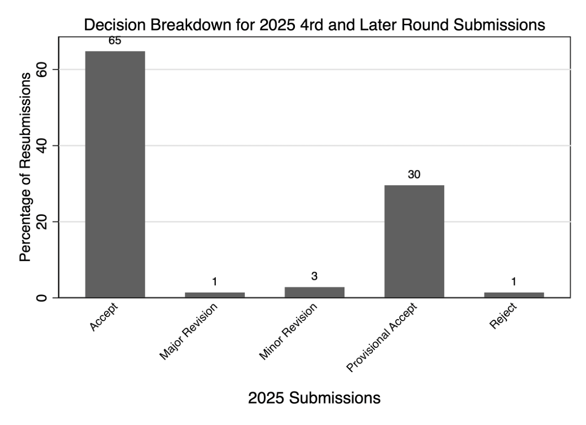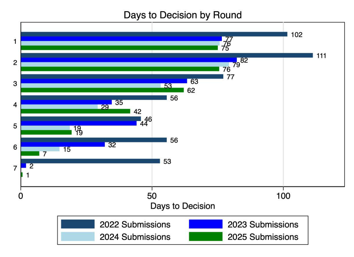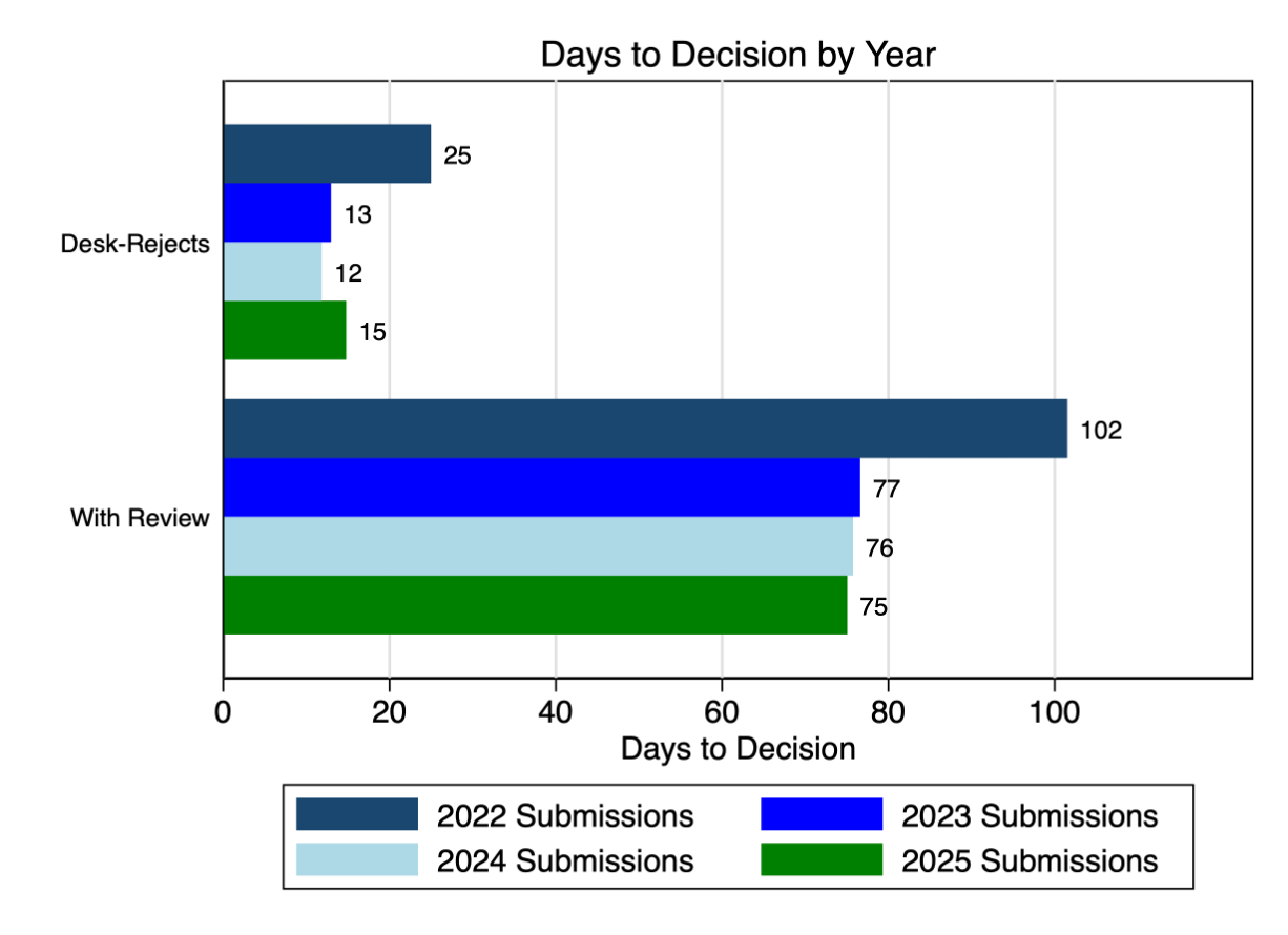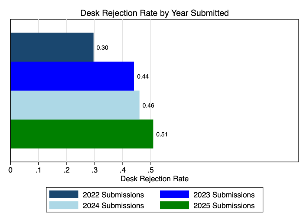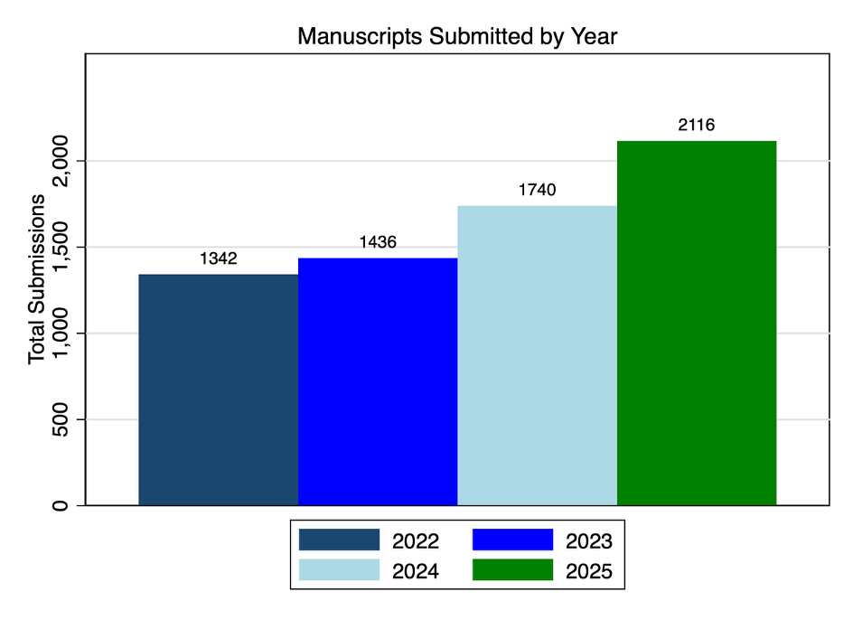 2025 was a year of consistency for the journal as we maintained the efficiency and quality of our operations and expanded on the scientific output—not in paper counts, but rather in topics and types. 2024 produced 100 publications as we closed the backlog of papers from pre-2023, so in 2025 there were less: 78 peer reviewed papers and our first Crossroads in years. Because submissions were way up (25%), this meant a lower acceptance rate, but we believe that most of the submission increases were from heavy-AI papers. I did not expect we would cross 2116 before my first term ended. Desk-rejects were up above 50% last year to partly to manage limited resources, but primarily because our retrospective analysis identified that we desk rejected nearly all the primarily AI-written papers we received. We have some accepted papers that aren’t quite out yet that I’m excited to share soon, including our first dataset paper and a famous field experiment on AI use in professional services firms. But first, here’s the tidal wave. . .