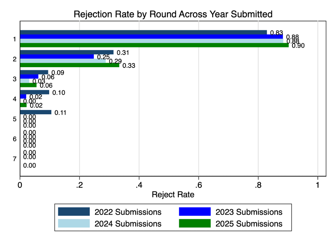 Here’s our rejection rate across rounds. Our second round rejections are up this year, partly due to increased qualitative submissions (which naturally have more), but the key statistics are in Round 3 and later.