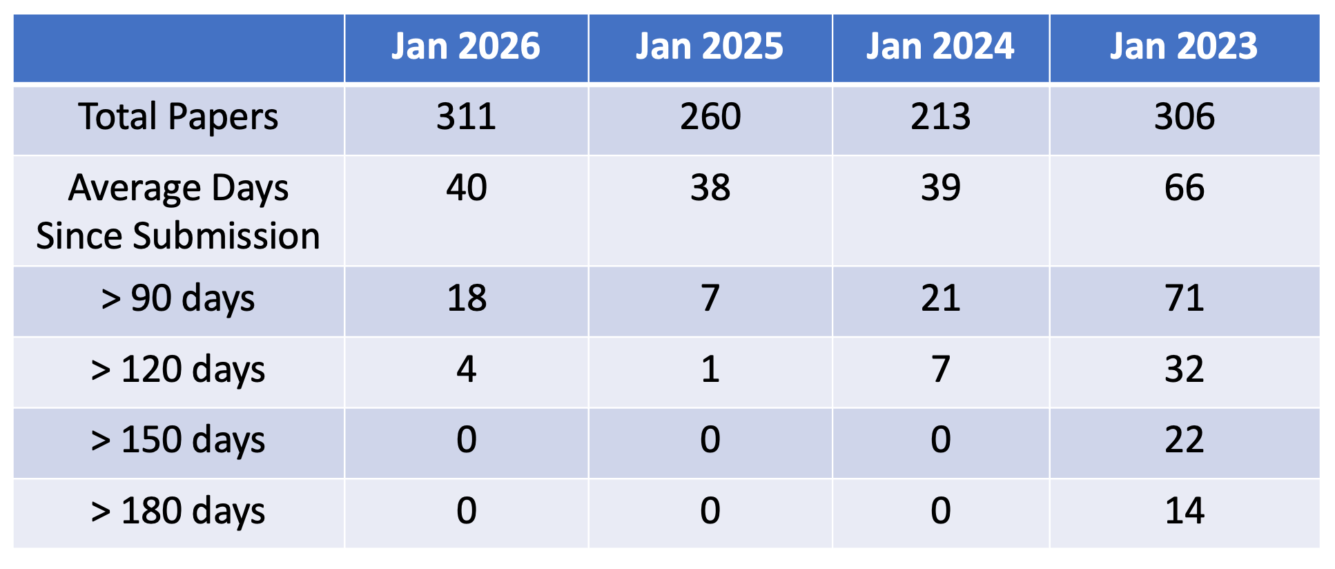 Averages of course hide the tails, but we’ve held remarkably steady the last three years. Desk rejects crept up a bit, but as Sharique notes, the humans (us) are tired and the White Walkers (AI papers) are relentless and growing in number.
